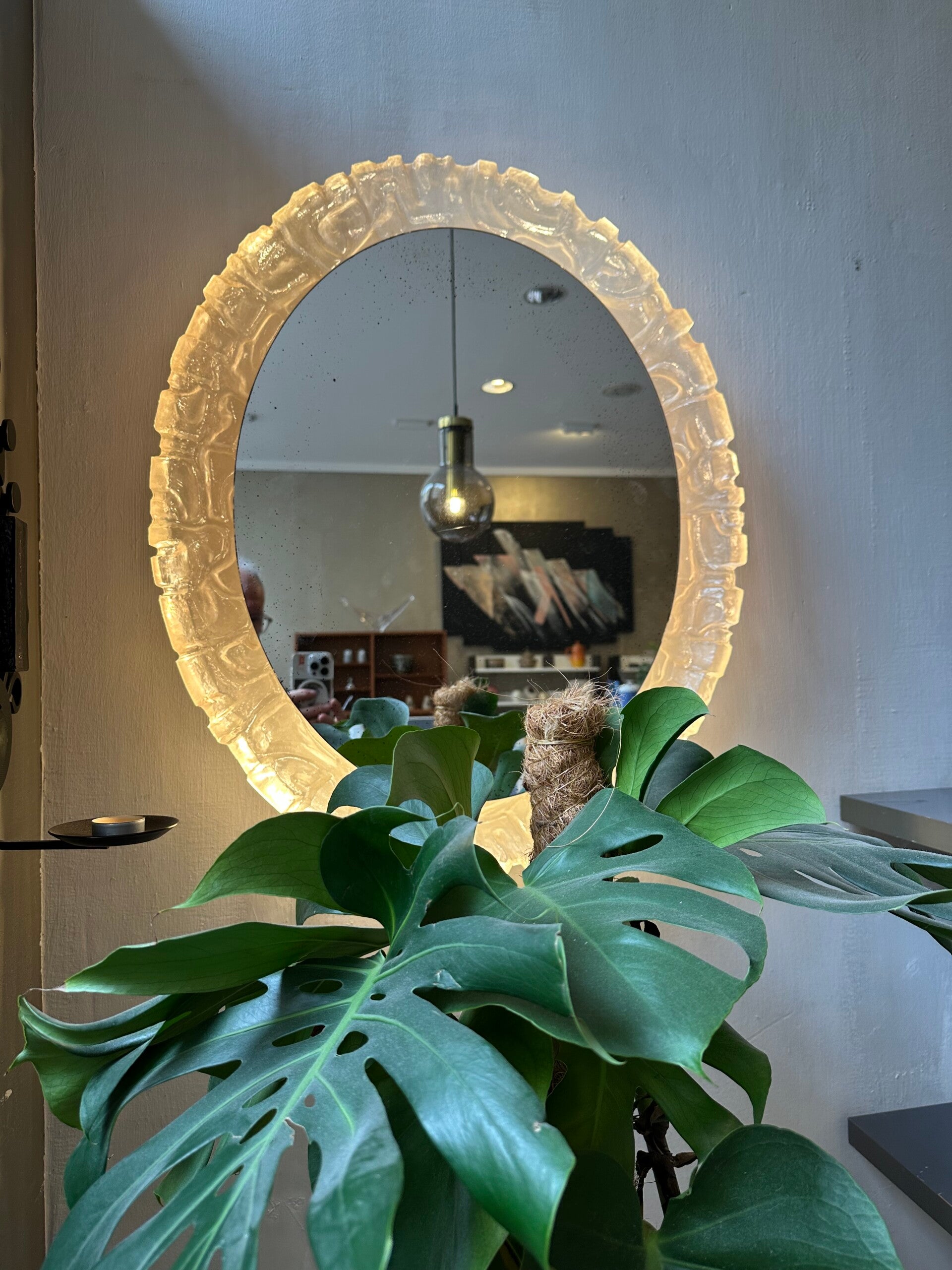 Made of metal with plexiglass and was produced in the 60s. Behind the mirror are six lamps